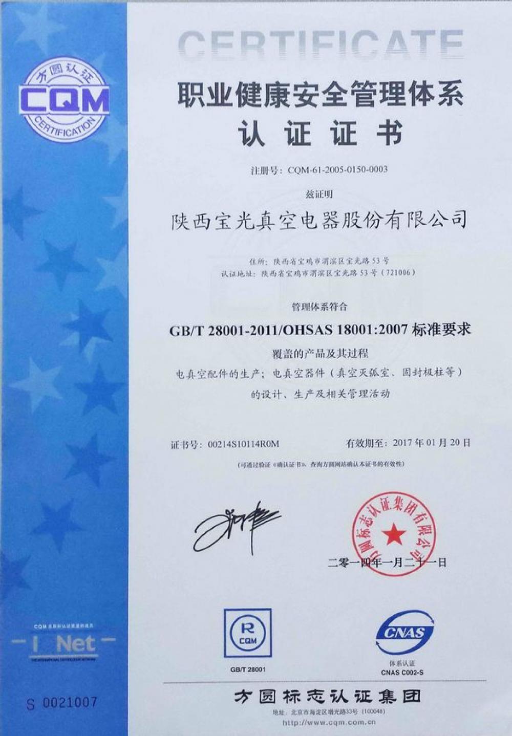 - 2014年通過OHSAS 18001:2007職業(yè)健康安全管理體系認證