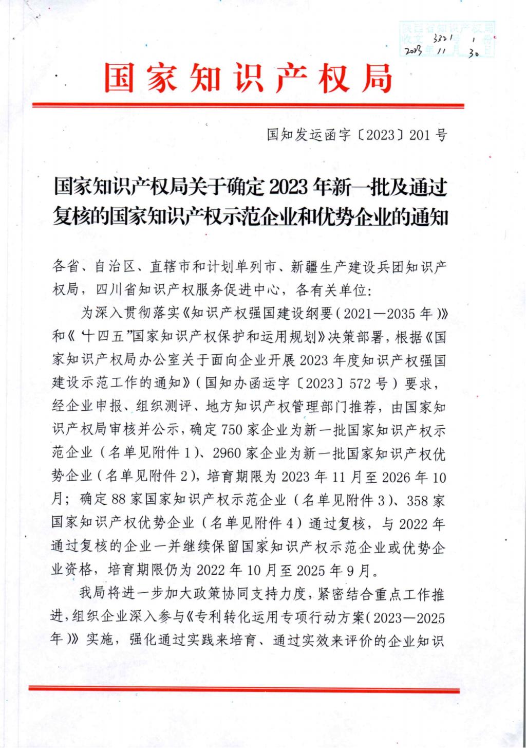 - 2023年榮獲國家知識產(chǎn)權(quán)示范企業(yè)和優(yōu)勢企業(yè)