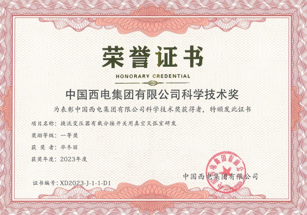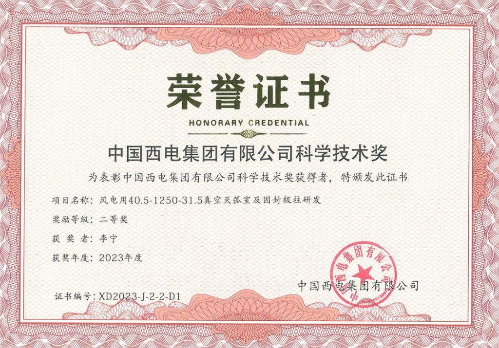 近日,寶光股份《換流變壓器有載分接開關用真空滅弧室研發(fā)》與《風電用40.5 kV/1250 A-31.5 kA真空滅弧室及固封極柱研發(fā)》兩個技術創(chuàng)新項目,分別榮獲2023年度中國西電集團科學技術獎“一等獎”與“二等獎”!