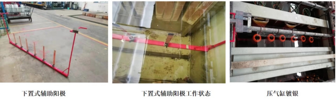 針對原輔助陽極的不足制定改善措施,利用車間閑置的不銹鋼材料焊接制作成一個新結(jié)構(gòu)的輔助陽極,新輔助陽極整體布置在鍍槽底部,可以夾裝6塊銅板、銀板,鍍銅、鍍銀過程中通過輔助陽極上銅板、銀板的電解,并及時補(bǔ)充壓氣缸內(nèi)腔溶液中消耗的銅離子、銀離子,保證了壓氣缸內(nèi)腔電鍍?nèi)芤撼煞值姆€(wěn)定。經(jīng)過近一個月的生產(chǎn)驗證,采用新結(jié)構(gòu)的輔助陽極生產(chǎn)的壓氣缸內(nèi)腔鍍層外觀良好,無發(fā)黑、起黑點等問題,零件熱震無起泡,滿足了百萬伏零件質(zhì)量要求。