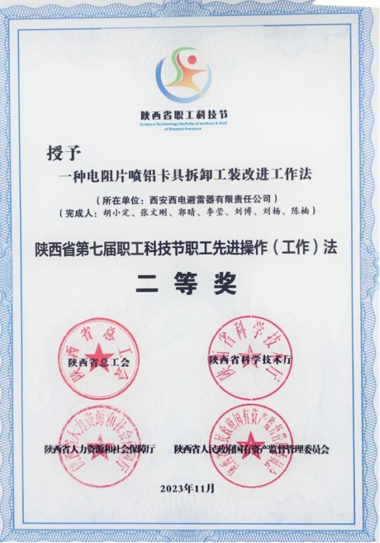 陜西省職工先進(jìn)操作(工作)法優(yōu)秀獎——西電避雷器“一種提高電阻片造粒料回收率和質(zhì)量的先進(jìn)操作方法”