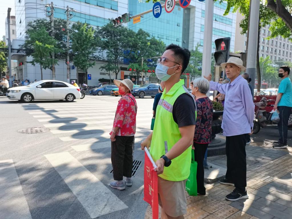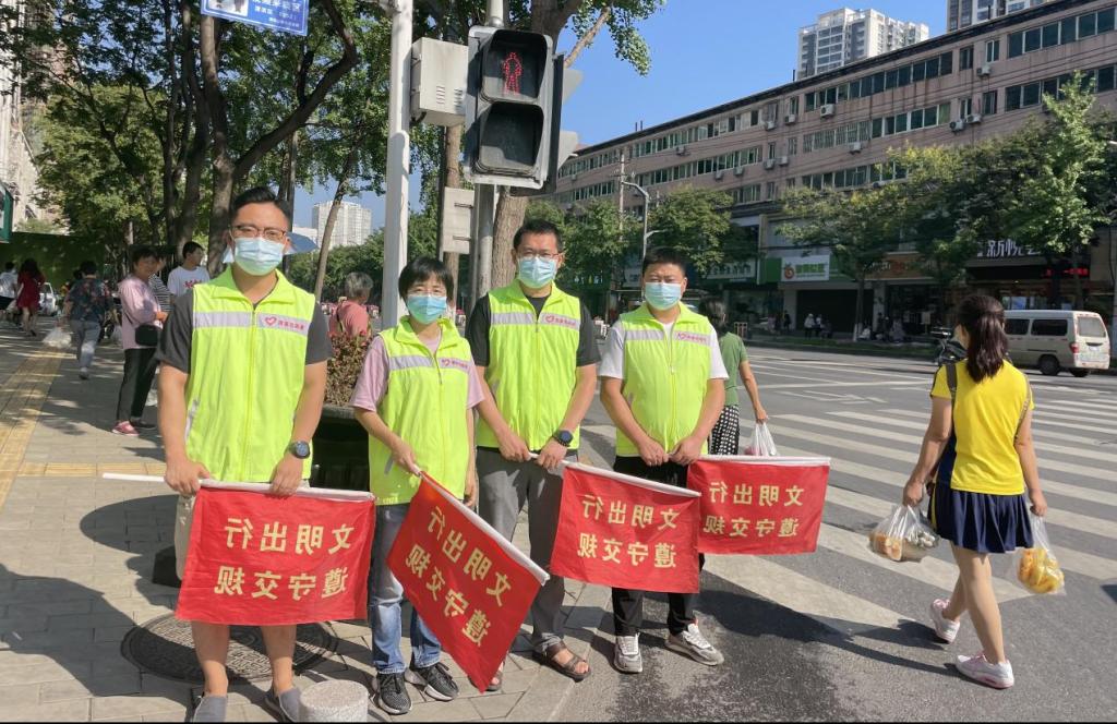 頂著炎炎烈日,志愿者身穿“黃馬甲”站在峪泉路和公園路十字路口,及時(shí)對(duì)行人和非機(jī)動(dòng)車橫穿馬路、亂闖紅燈等不文明交通行為進(jìn)行勸導(dǎo),引導(dǎo)其遵章守紀(jì)、文明出行,同時(shí)還耐心熱情地為需要幫助的行人指路,以實(shí)際行動(dòng)傳遞社會(huì)正能量和新時(shí)代文明新風(fēng)尚。