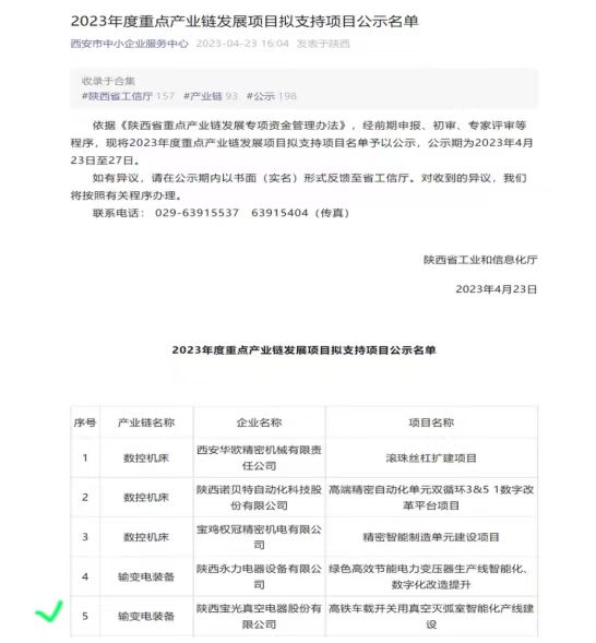 通過認(rèn)真籌備、資料審核及現(xiàn)場答辯,由公司組織申報(bào)的“72.5kV、126kV及以上高電壓等級真空滅弧室產(chǎn)品研發(fā)及產(chǎn)業(yè)化”項(xiàng)目與“高鐵車載開關(guān)用真空滅弧室智能化產(chǎn)線建設(shè)”項(xiàng)目分別中榜陜西省工信廳2023年關(guān)鍵核心技術(shù)產(chǎn)業(yè)化“揭榜掛帥”項(xiàng)目與重點(diǎn)產(chǎn)業(yè)鏈發(fā)展項(xiàng)目,并已進(jìn)入公示階段。